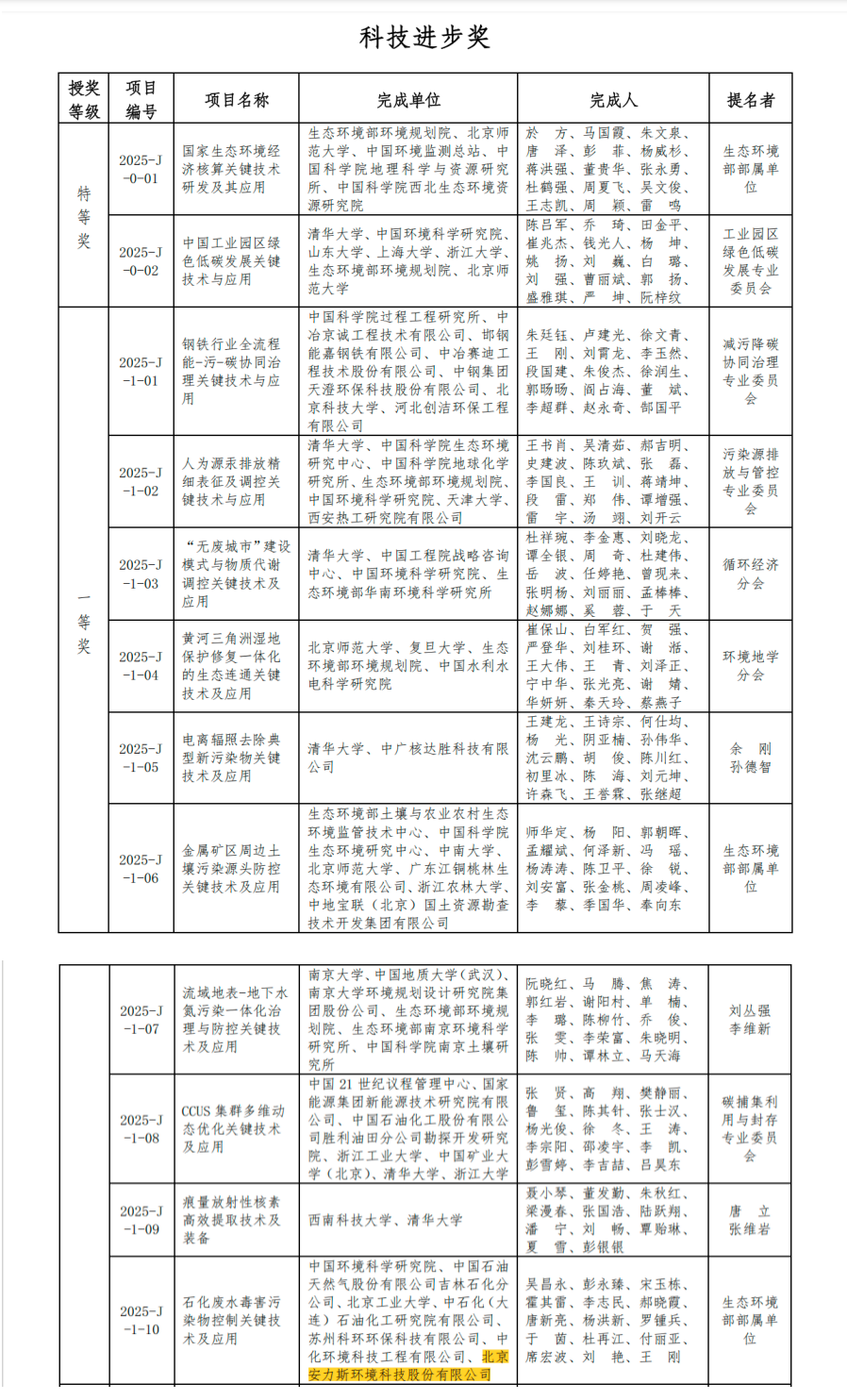 近日,2025年度環境保護科學技術獎獲獎名單正式揭曉。北京安力斯環境科技股份有限公司參與由中國環境科學研究院牽頭的“石化廢水毒害污染物控制關鍵技術及應用”項目,憑借其在光芬頓工藝方面的突出貢獻,榮獲科技進步獎一等獎(項目編號:2025-J-1-10)。這一榮譽標志著公司在工業廢水...